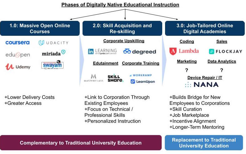 As the attractiveness of a standard college degree declines, I believe a new emerging digital-first educational model has the potential to disintermediate especially the long-tail of under-performing, lower ROI private universities in the US. Digital education is by no means new. The first internet attempt at democratizing education was through massive open online courses (MOOCs), aimed at unlimited participation in courses structured as traditional university lectures in a video format. Many of these course options were free, enabled by the low cost delivery infrastructure of the internet and often through subsidies from private and public universities. MOOCs did greatly expand access to general educational knowledge. However, because they were created to expand educational access as much as possible, MOOCs were not personalized and included limited lecturer / professor engagement. Because of these factors, students struggled to engage with coursework to completion.