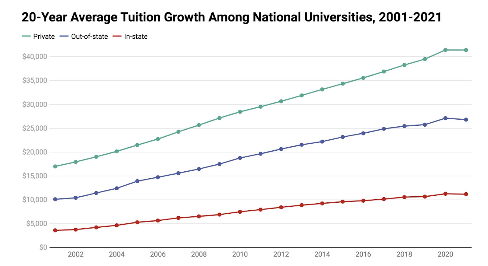 Over the last couple of years, the education sector has witnessed the rise of a new form of digitally native education that specializes in training, placing and re-skilling workers focused on breaking into particular professional functions. While COVID-19 has driven a boom for digital tools that have helped to transition physical education to an online environment (classroom management, device management, virtual lab technology, etc.), digital first education alternatives are growing in attractiveness. The cost of traditional university education has risen at accelerated rates that are multiples of the average US inflationary annual growth rate of 2-3%. The average tuition at private universities has more than doubled in 15 years: