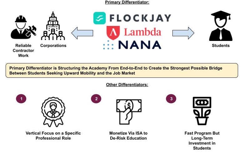 The primary differentiator of these academies is bridging the gap between students (either unskilled or looking to pivot professions) with higher paying jobs and more reliable work. Versus university or traditional digitally-native education, these academies build a stronger link to corporations that disintermediates the power of traditional university / academic brands through: