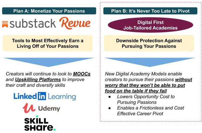 I believe these academies will play a critical role in enabling the passion economy by giving more individuals the comfort that they have a more than solid “plan B” if they are unsuccessful creating a sufficient living for their family by pursuing their passions. The rise of these academies significantly streamlines the process of pivoting from both a time and financial perspective, thereby reducing the earnings power opportunity cost to pursuing your passions. A rock solid “plan B” vs. having to pay $200K+ for an MBA or graduate school will drive more creative risk taking in pursuit of individual passions. Meanwhile, MOOCs and upskilling platforms will continue to play an important role in allowing creators to continue to improve their skills in a more informal way to diversify the ways they can further monetize their own passions. These two technologies will work synergistically to drive greater upwards mobility and work satisfaction by increasing participation in the passion economy.
