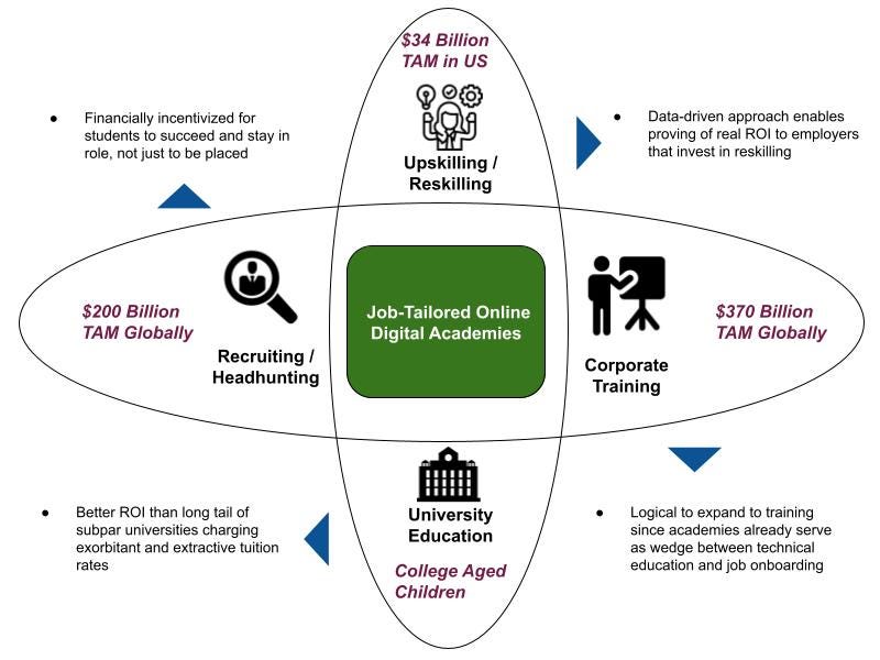Further, these academies are end-to-end programs that teach how to perform a profession (not just one-off skills), but are much shorter than a standard university degree or associate degree. These programs can be completed at the desired pace of the student, but many last only 2-6 months, accelerating the road to upward mobility. Despite the short-term engagement with students, many of these academies also offer mentorship and continued education / upskilling that maintain a long-term connection with the student. I believe these academies blend the best qualities of numerous business models and can capture share from four sizeable primary markets over the long-term: university education (TAM is at a minimum, every young adult 17-22 in the world), corporate training (TAM is $370B+), upskilling (cost to upskill the US workforce is $34B+) and headhunting / recruiting (TAM is $200B+):