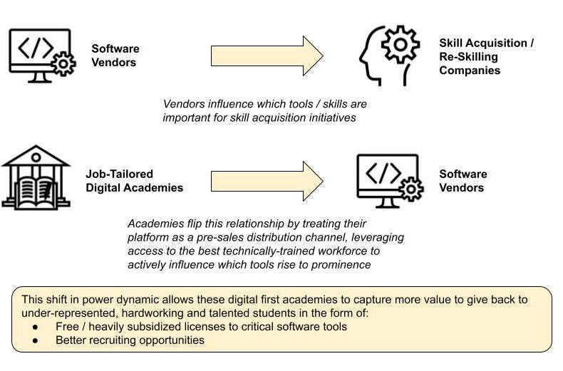 This also helps build brand equity for software vendors amongst the next generation of leaders and influencers within a professional category like sales. As these academies continue to validate the stronger performance of their post-graduate students through data benchmarking, it will reinforce the desire for software vendors to form partnerships for these academies to teach with their tools so that high-performing graduates will evangelize the benefits of their brand’s software and become advocates when they practice. In effect, I believe these academies will become critical distribution and pre-sales channels for enterprise software vendors. This is a powerful shift from the skill acquisition / upskilling business model which takes it as given which technical skills are professionally valuable. Digital academies will have a more dynamic relationship with corporate vendors where they will leverage access to the best trained technical workers to actively shape which tools rise to prominence across multiple sectors: