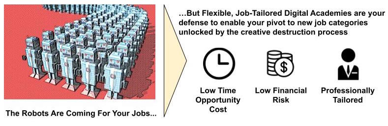 While it is certainly possible that artificial intelligence and sophisticated robotics are different in form than other types of innovation that created net new jobs, I am optimistic they will also create new categories of roles in robotics engineering, algorithmic compliance, data collection, creative professions and more. However, I do think that this new class of technologies will especially accelerate the pace of innovation. As innovative disruption occurs more frequently, the world will need an educational system that is more flexible and allows workers to more easily pivot between jobs as the skills and roles demanded by employers change on a recurring basis. Relative to traditional educational systems, digital first academies will enable workers to more easily move between jobs. They differentiate on the basis of a couple of different factors: