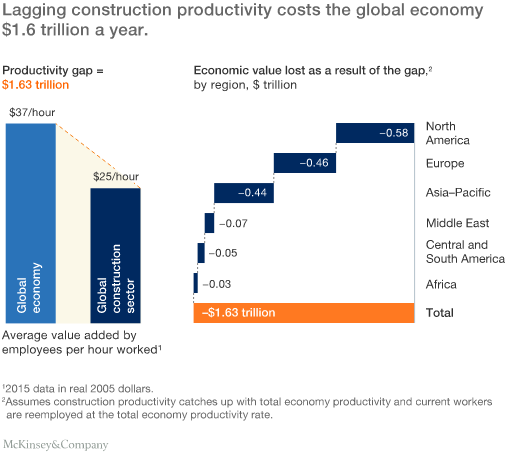 However, relative to other sectors in the global economy where productivity has increased meaningfully over time, construction productivity has been stagnant. McKinsey estimates that the productivity gap between construction and the average in other industries costs up to $1.6 trillion per year, with the bulk of that inefficiency coming from North America, Europe and Asia-Pacific: